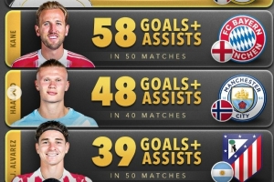 2025年前锋参与进球榜:姆巴佩62球居首,凯恩次席,哈兰德第三