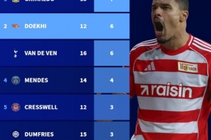 今年后卫参与进球榜:阿什拉夫21球居首,门德斯、邓弗里斯19球